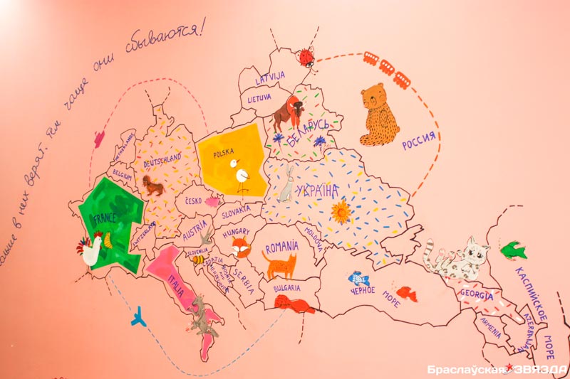 На мінулым тыдні адбылося ўрачыстае закрыццё KAJAпленэру. Міжнародная творчая група пакінула пасля сябе не толькі цікавыя малюнкі на сценах установы адукацыі. Для дзяцей-інвалідаў яе члены сваімі рукамі зрабілі развіваючыя цацкі, арэлі-караблік, шырму для лялечнага тэатра, макет лабірынта для дзіцячай гульнявой пляцоўкі.