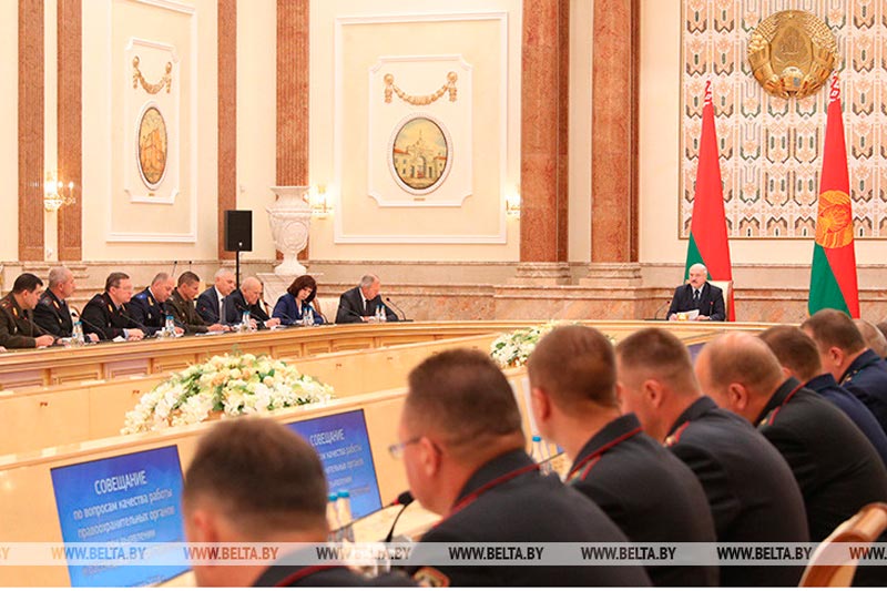 Подводя итоги совещания, Александр Лукашенко ориентировал правоохранительные органы на более качественную работу в сфере защиты законных прав граждан. «Вы не только должны быть чистилищем, но и уметь вовремя проинформировать Президента с целью защиты людей», — сказал глава государства. «Исходя из того, что я только обозначил, вы со мной согласитесь, что сегодня не рядовое совещание у Президента, и по всем фактам мы должны принять соответствующие решения», — подчеркнул Александр Лукашенко. Обращаясь к руководству Администрации Президента, он сказал: «Кадры надо не только назначать, но и оберегать их. А жуликов и проходимцев надо каленым железом выжигать из наших рядов». «Справедливое должно быть отношение к людям! Ведь сами можем оказаться на месте тех людей, которых вы порой прессуете, и незаконно. Выводы сказанного мною: правоохранительные органы должны работать не просто эффективно, а качественно, толково. И в основу надо положить не только закон (в нем не пропишешь все, что происходит в жизни) — положите в основу справедливость. Не давите людей излишне. Но, с другой стороны, не прощайте ничего подонкам, негодяям и бандитам. Ибо о стабильности потом в нашем обществе разговора быть не может», — резюмировал Президент. Лукашенко отмечает серьезные недостатки в работе правоохранительной системы Обращения граждан и правоприменительная практика выявляют проблемы, причем в ряде случаев достаточно острые. «Недавний пример (он активно обсуждался в СМИ, но я не хочу мусолить его) — это дело главного инженера Минского завода колесных тягачей. Я не так однозначно оцениваю его, как в обществе и даже как в суде. Но об этом мы поговорим отдельно. Это очень хороший и яркий пример вашей работы как по сути, так и по форме, в частности, милиции, — отметил Александр Лукашенко. — Количество обращений, другие резонансные дела свидетельствуют о серьезных недостатках и просчетах в работе оперативно-разыскных и следственных подразделений, а также, к сожалению, прокуратуры». По его словам, у людей порой складывается впечатление, что сотрудников правоохранительных органов в первую очередь интересуют не жизнь и судьба человека, а цифры и рейтинги, которыми измеряется эффективность их работы. «Притом фальсификация в ходе расследования уголовных дел такова, что лучше бы вы не возбуждали эти уголовные дела. Некоторые в погонах прибурели и оборзели до того, что они не просто не должны их носить — эти люди должны быть изъяты из нашего общества в первую очередь, прежде чем те, дела которых они расследуют», — заявил глава государства. Еще хуже, добавил глава государства, когда это сопровождается применением активных силовых методов, несоразмерных возникающим ситуациям. «Видите ли, вершители судеб! Ворвавшись в дом при детях, беременных женах, положить человека мордой в пол, как у вас принято говорить, заломить руки, поломать несколько ребер, и сотрясение мозга — это как минимум. Это безмозглые люди, которым также не место в правоохранительной системе. Что вообще недопустимо в практике силовиков — появляется новая «форма» работы — прямое давление на участников уголовного процесса. Даже к судьям подъезжают и начинают на них накатывать: да мы с вами, да мы вас будем прессовать, наклонять», — рассказал Президент. Александр Лукашенко возмутился, что его 