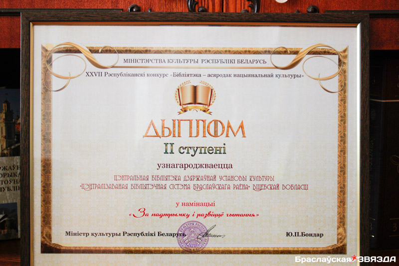 Сёлета ў гэтым конкурсе прынялі ўдзел каля 40 публічных бібліятэк. Свой вопыт работы ў арыгінальным афармленні прадставілі і супрацоўнікі раённай цэнтральнай бібліятэкі. Журы высока ацаніла дзейнасць браслаўчан і ў намінацыі «За падтрымку і развіццё чытання» адзначыла іх дыпломам ІІ ступені. Сімвалічна, што цырымонія ўзнагароджання пераможцаў рэспубліканскага конкурсу адбылася ў Дзень беларускага пісьменства ў Слоніме.