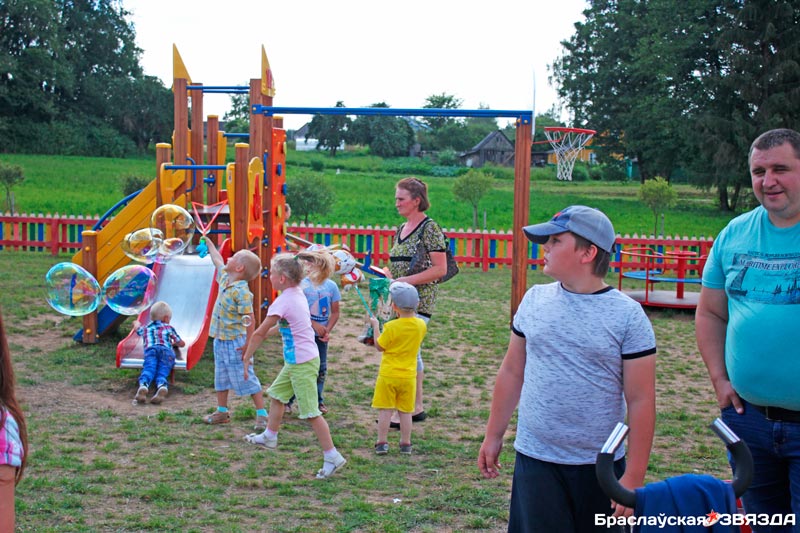 Летний праздник проходил в популярном в агрогородке месте-на площадке МЧС. С разных ее сторон доносилась музыка и детский смех. Вокруг площадки разместились надувные аттракционы и батуты, которые очень порадовали детей: движение там не останавливалось ни на минуту. Настоящий «бэби-бум»! Малышам очень понравилась и ростовая кукла. Здесь же работали и торговые палатки, особенно оживленно было около той, где продавались попкорн и сладкая вата, игрушки. Самыми востребованными стали мыльные пузыри, причем наслаждение от них получали не только малыши, но и взрослые.