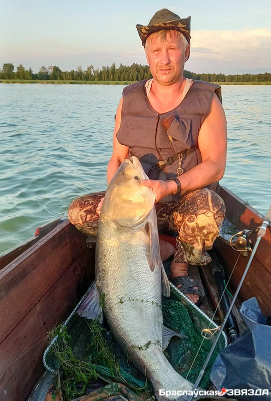 Возвращаясь обратно, Николай и Елена решили еще поискать рыбацкого счастья на оз. Болойсо во время вечернего клева – и не прогадали. Забросив на глубине 4 – 5 метров тяжелую блесну-колебалку, уже через несколько витков безинерционной катушки Н. Матрунёнок почувствовал, как спиннинг в его руках изгибается дугой, а мононить уверенно стравливается со шпули. Сорок минут неизвестная пока рыба против волны «катала» на плоскодонке супружескую пару, пока спиннингист пытался поднять ее на поверхность. Добычей оказался огромный толстолобик, которому блесна зацепилась за верхний плавник. Прошло еще двадцать минут настоящей борьбы рыболова с рыбиной, пока она не оказалось в подсачике, а затем – и на дне лодки.