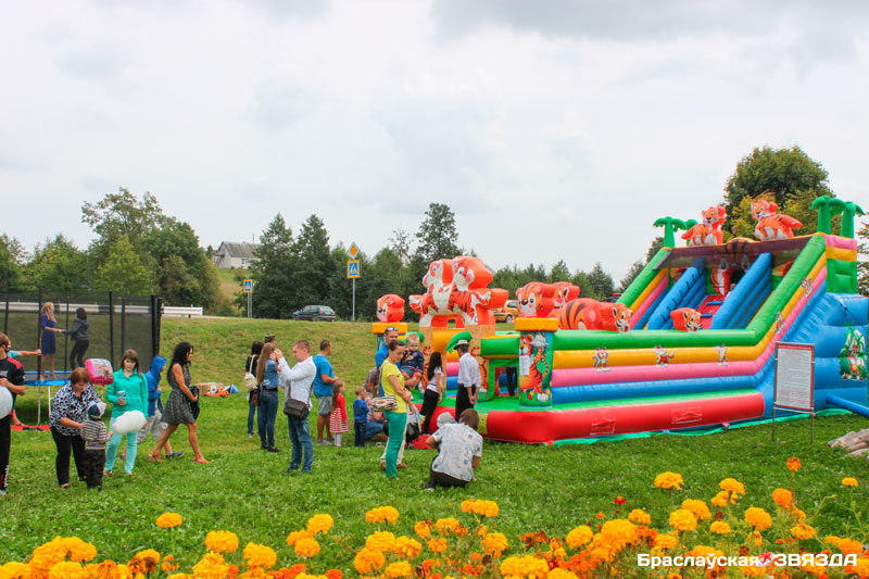 У прыгожай зоне адпачынку «Ля млына» разгарнулася гульнявая пляцоўка, дзе малыя з задавальненнем каталіся на надзіманай горцы, скакалі на батуце, фатаграфаваліся з роставай лялькай.