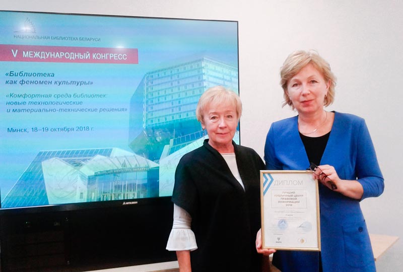 Дыплом за подпісам міністра культуры Рэспублікі Беларусь, набор друкаванай прадукцыі Нацыянальнага цэнтра прававой інфармацыі і сертыфікат на атрыманне лазернага прынтара былі ўручаны загадчыку аддзела бібліятэчнага маркетынгу Цэнтральнай бібліятэкі Ірыне Макарэвіч. Неўзабаве ўсе прызы адправяцца ў Слабодкаўскую бібліятэку, дзе імі змогуць карыстацца наведвальнікі ПЦПІ і ўсе чытачы. ■