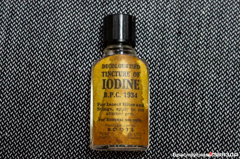 Нязвыклая, на наш погляд, маленькая бутэлечка з празрыстай вадкасцю і са знаёмым пахам «Decolourised tincture of iodi» 1934 года была прывезена жыхаром Браслаўшчыны Альфонсам Жукоўскім, які служыў у польскім войску і знаходзіўся ў Англіі. Мужчына, дарэчы, меў шмат узнагарод, у тым ліку мальтыйскі ордэн каралевы Брытаніі.