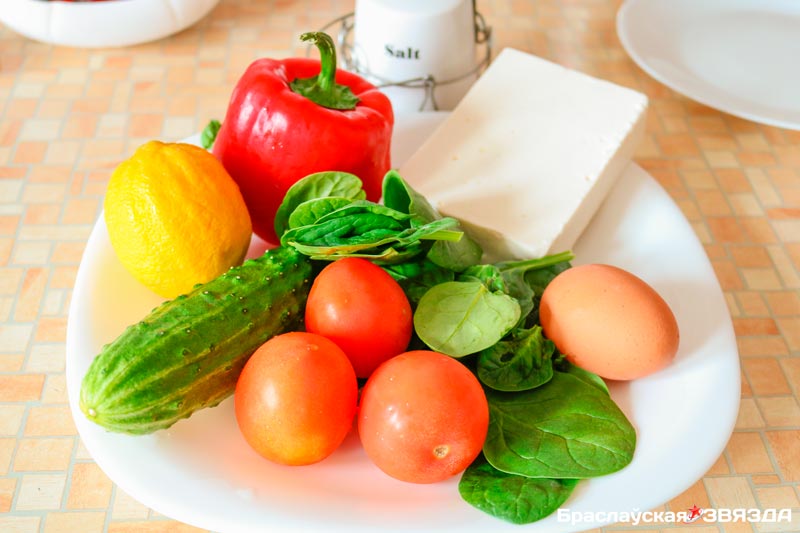• СМЕСЬ САЛАТНЫХ ЛИСТЬЕВ; • ЯЙЦО КУРИНОЕ —1 шт.; • ОГУРЦЫ —1 шт.; • СЛАДКИЙ ПЕРЕЦ — 1 шт.;• ЛИМОН — 2 кружочка; • СЫР ФЕТА; • ОЛИВКОВОЕ МАСЛО — 2 ст. л.; • СОЛЬ, СПЕЦИИ ПО ВКУСУ