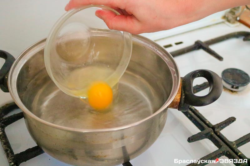 Для этого поставьте маленькую кастрюлю с водой на плиту. Нужно довести воду до кипения, но она не должна сильно бурлить. Добавить немного соли и 1 ст. л. уксуса на пол-литра воды. На тарелку аккуратно разбить яйцо, чтобы желток остался целым. Ложкой или венчиком хорошо размешать воду до образования воронки и потихоньку влить, опустить туда яйцо. Через три минуты достать его и выложить наверх салата, поперчить.