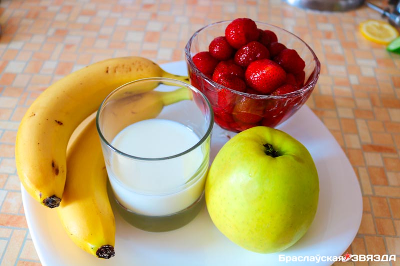 • БАНАН — 1 шт.; • ЯБЛОКО — 0,5 шт.; • ЯГОДЫ КЛУБНИКИ — 1 стакан.