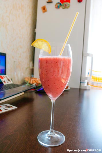 Заливаем полученную смесь 100 мл молока, взбиваем ее в однородную массу. Разливаем смузи по бокалам и украшаем ягодами или кусочком лимона.