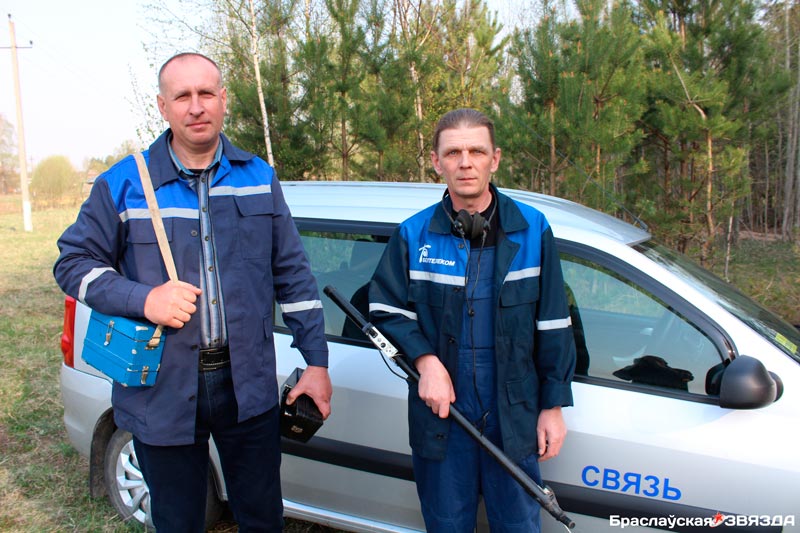 На фото: В слаженном дуэте электромеханик линейных сооружений связи и абонентских устройств Юрий Шакель и кабельщик-спайщик 5 разряда Павел Половинчиков обеспечивают современными услугами электросвязи жителей Слободки, Друйска, Быстромовцев, Оплисы и прилегающих к ним деревень.