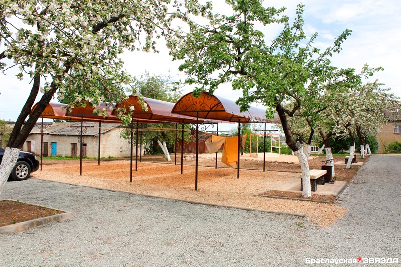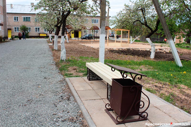 Прыемна прайсціся і па двары. Праезная частка спланавана і засыпана шчэбенем. Для адпачынку ўстаноўлены дыхтоўныя лаўкі з драўляных брусоў і габіёнаў у якасці апор, побач з імі — урны з элементамі халоднай коўкі металу.