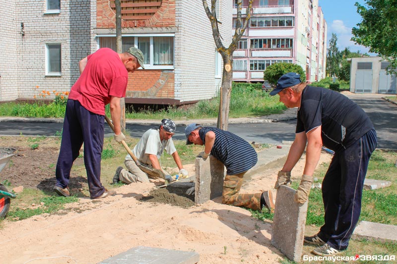 На фота: Рабочыя адной са зводных брыгад укладваюць тратуарную плітку ў двары паміж дамамі № 57 Б і № 65 па вул. Садовай.