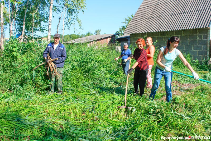 А вось на скрыжаванні вуліцы Пясчанай з аднайменным завулкам на ўборцы пустазелля ў аб’ектыў фотаапарата карэспандэнта райгазеты трапілі і жаночыя постаці, бо грамадская работа тут і па іх сіле.