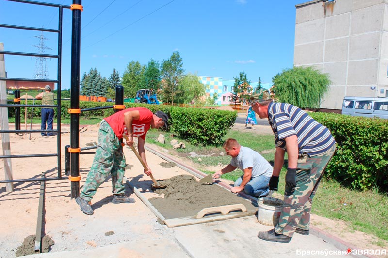 Каля дзіцячага сада № 3 канторскія работнікі прадпрыемства граблямі раўнуюць высыпаны на абочыну шчэбень і прывезены ўрадлівы слой. А побач з імі брыгада бетануе аснову пад гумовае пакрыццё для вулічных заняткаў варкаўтам.