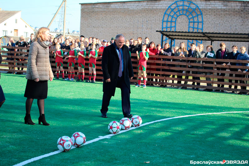 Выступая с поздравительным словом, Иван Горовец отметил, что в нашей стране уделяется большое внимание социальным проектам, доступности людей всех возрастов к спортивным сооружениям и важно, чтобы подрастающее поколение имело возможность заниматься любимым видом спорта в любое время. Представитель ассоциации БФФ призвал не отставать от мальчишек и девочкам, предложил им также активно вливаться в футбол и пожелал всем побольше победных игр. О значимости социального проекта для города, важности здорового образа жизни и спорта в повседневных буднях говорила и Наталья Черник. Она также пожелала юным футболистам покорения новых спортивных вершин. От имени браславчан за подарок городу гостей выразил признательность председатель райисполкома Александр Боданин. «Реализация этого проекта очень важна для нас. Я хочу поблагодарить всех причастных к нему за то, что нас слышат, видят нашу потребность и желание заниматься спортом, создают условия для активной и здоровой жизни. Думаю, наши спортсмены своими результатами докажут, что достойны этой площадки. Самой же большой наградой для всех присутствующих будут победы местных футбольных команд на соревнованиях различного уровня, когда через имена браславчан о районе узнают и за пределами региона», — подчеркнул в своем выступлении А. Боданин. На добрую память об этом дне и в знак уважения председатель райисполкома вручил Ивану Горовцу и Наталье Черник благодарственные письма.