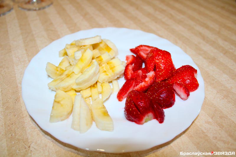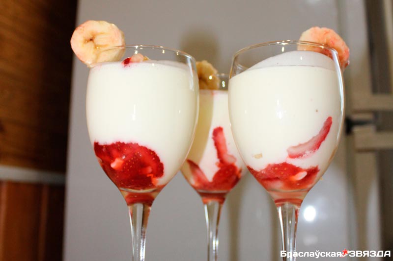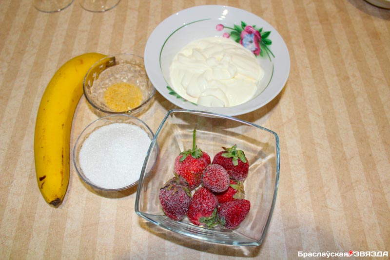 ИНГРЕДИЕНТЫ: • СМЕТАНА — 300 г; • САХАР — 100 г; • ЖЕЛАТИН — 12 г; • БАНАН — 1/2 шт.; • КЛУБНИКА — 5 шт.