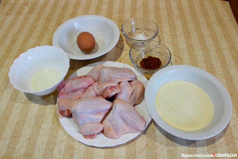 • КУРИНЫЕ КРЫЛЫШКИ — 8 шт.; • ЯЙЦО — 1 шт.; • КРУПА МАННАЯ — 100 г; • МАСЛО РАСТИТЕЛЬНОЕ; • СОЛЬ И СПЕЦИИ ПО ВКУСУ.