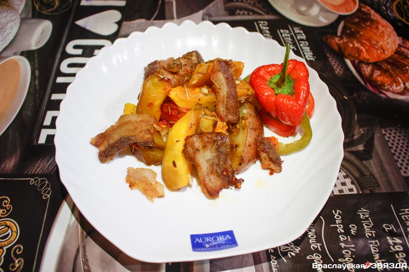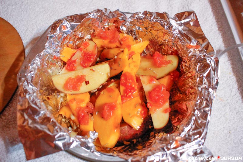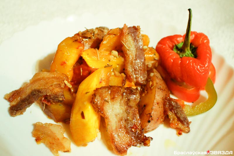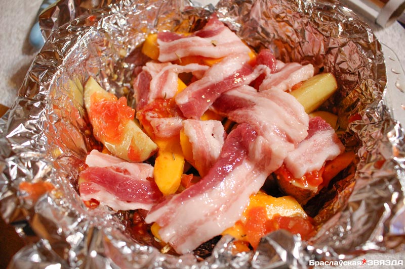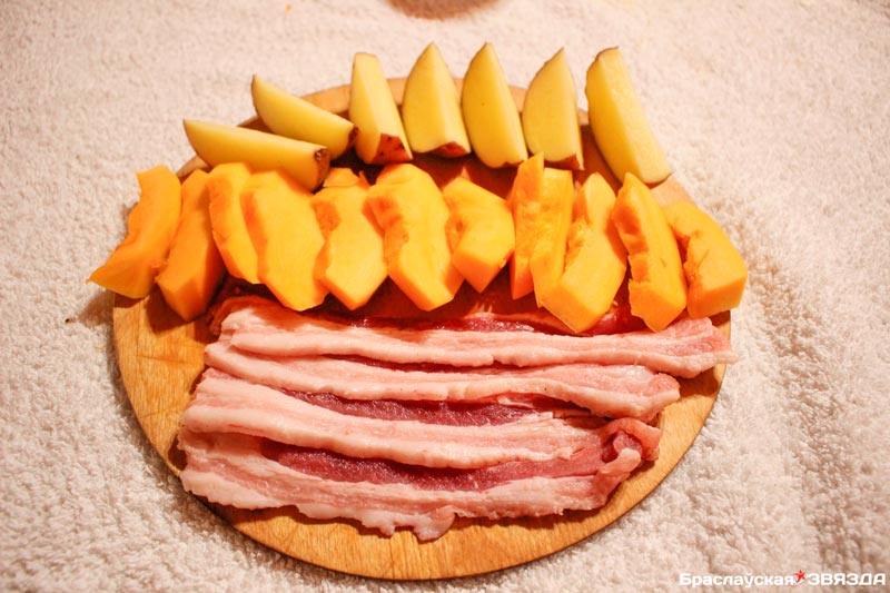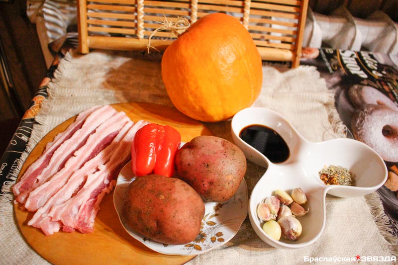 Ингредиенты: СВЕЖИЙ БЕКОН — 300 г; ТЫКВА — 300 г; КАРТОФЕЛЬ — 2 шт; РАСТИТЕЛЬНОЕ МАСЛО — 20 г; СОЕВЫЙ СОУС — 50 г; АДЖИКА — 100 г; ЧЕСНОК — 1 головка; ПРИПРАВЫ.
