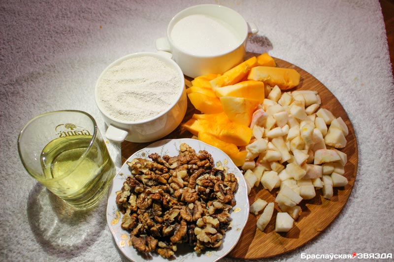 Ингредиенты: ТЫКВА — 150 г; ВОДА — 300 мл; ЯБЛОКИ — 2 шт.; САХАР — 0,5 ст.; РЖАНАЯ МУКА — 1 ст.; ГРЕЦКИЕ ОРЕХИ — 100 г; РАСТИТЕЛЬНОЕ МАСЛО — 1/2 ст.; КОРИЦА — 1/2 ч. л.; СОДА — 1 ч. л.; СОЛЬ — щепотка; ВАНИЛИН — щепотка.