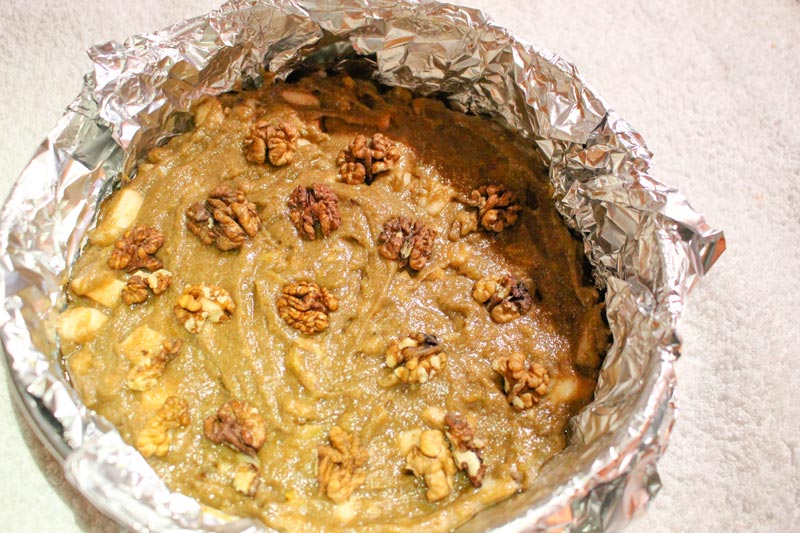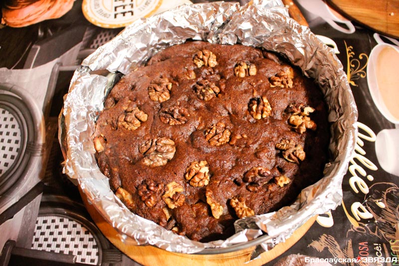 Орехи измельчить ножом и добавить их в тесто, перемешать. Форму для выпечки смазать растительным маслом, выложить тесто. Поставить в духовку, разогретую до 200°C, на 35 — 40 минут. Достать пирог из духовки и дать ему полностью остыть в форме.