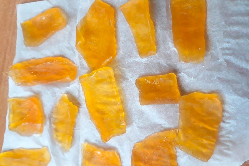 Сушить естественным способом либо в духовке. Если выбирать второй более быстрый способ, то листы с тыквой нужно перенести на противень и поместить в духовку, нагретую до 100 градусов. Сушить до полного высыхания цукатов. Духовку не следует плотно закрывать. Готовые цукаты можно пересыпать сахарной пудрой или кукурузным крахмалом. При приготовлении лакомства можно добавлять ваниль, корицу или те специи, которые любите больше. ■