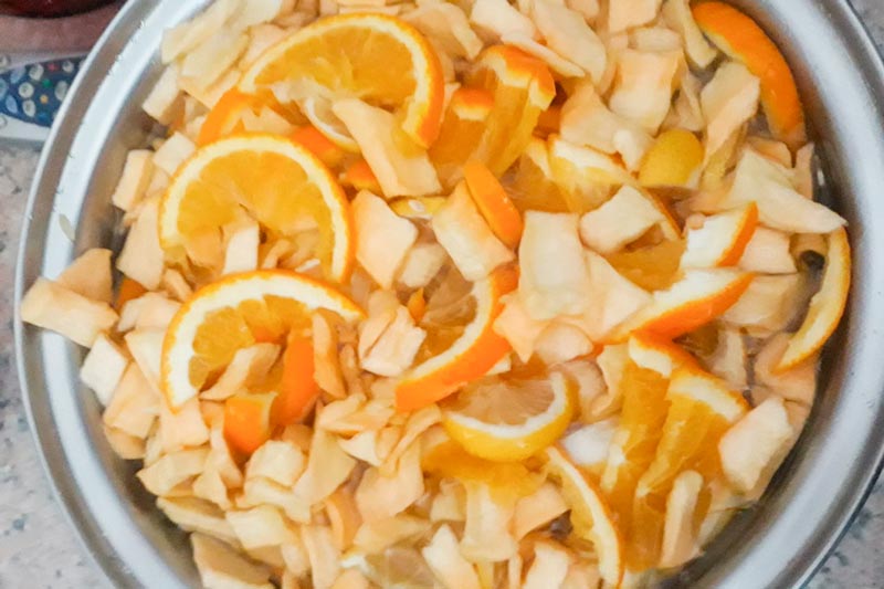Приготовление: Тыкву помыть, очистить от кожицы и семечек, нарезать кубиками. Переложить ее в глубокую емкость, засыпать сахаром. Добавить порезанный лимон и апельсин, оставить на 12 часов в холодильнике.