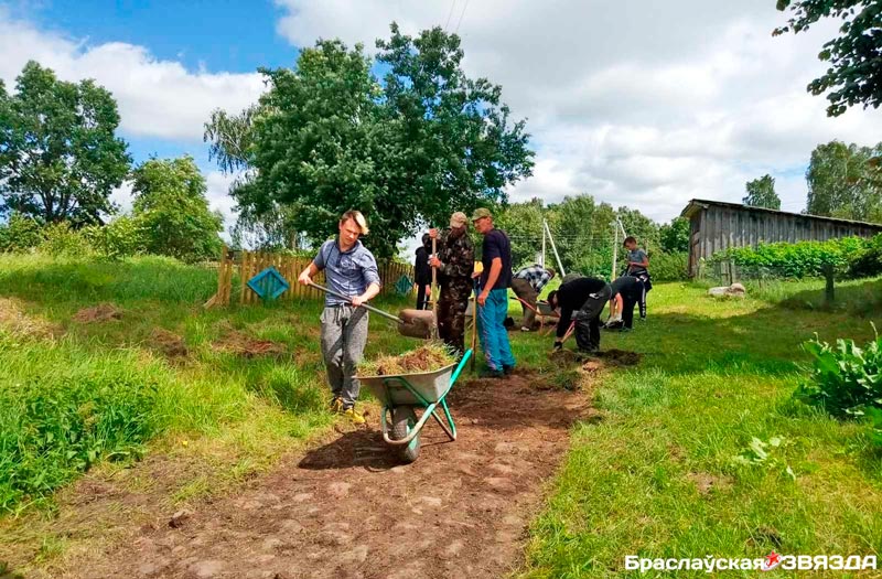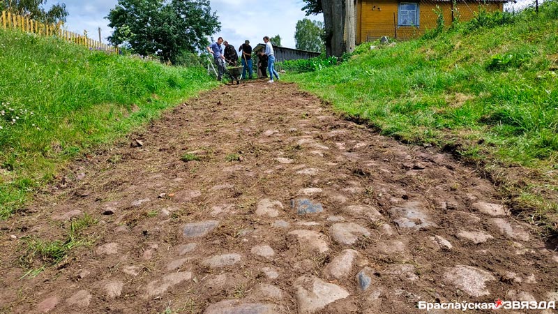 К ним присоединились волонтеры из Браслава и Новополоцка, отец Игорь Чечукович с воспитанниками из православного лагеря. Первым делом начали очищать от травы и земли так называемую Дорогу смерти, которая ведет к печально известному месту расстрела еврейского населения в Друе, обладающему исторической значимостью. С годами дорога заросла травой и от былого покрытия не осталось и следа — лишь несколько камней.