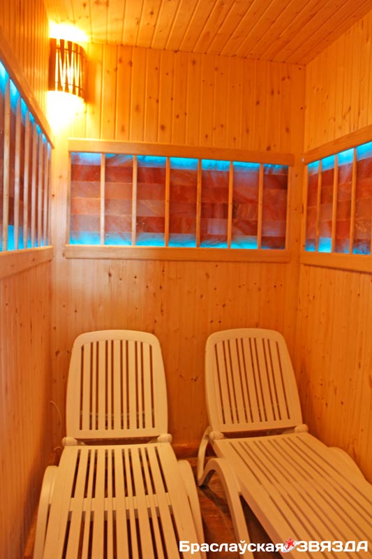 Соляная комната — это совершенно новый вид услуги для браславчан. Соляной она называется потому, что ее обшитые вагонкой стены декорированы плиткой в виде панно из гималайской соли с подсветкой. Такое оформление вкупе с мягким свечением соляных блоков создает расслабляющую атмосферу. Посетителям соляной бани ничего не нужно делать. Достаточно зайти в помещение, удобно расположиться на деревянных лежаках и просто расслабленно вдыхать пары соли.