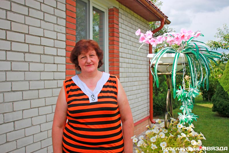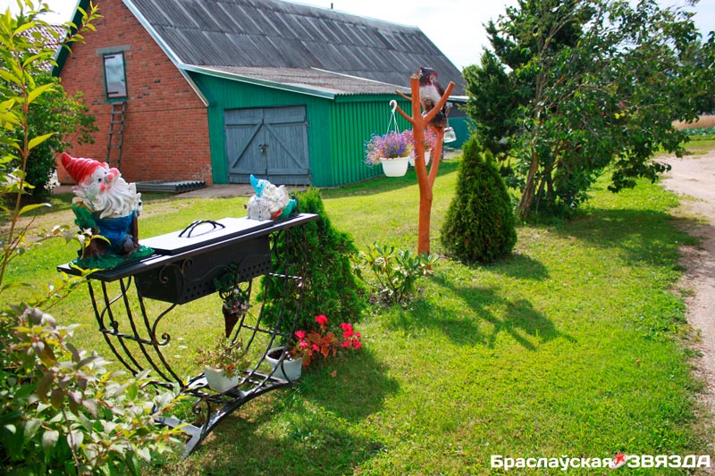 Улица Набережная на окраине агрогородка относительно молодая. Добротные кирпичные дома вдоль дороги утопают в зелени, привлекают внимание пестрыми клумбами. Видно, что каждый хозяин здесь старается как можно лучше оборудовать свое подворье. Но одна усадьба настолько впечатляет особым ландшафтом, что пройти ее никак не могу и иду знакомиться с хозяевами. В доме живут Валентина Циунель и ее муж Виктор. Оба работают в СПК «Маяк Браславский»: Виктор — водителем, а Валентина уже 27 лет усердствует в колбасном цехе. Хозяйка, обаятельная и приветливая женщина, рассказывает: