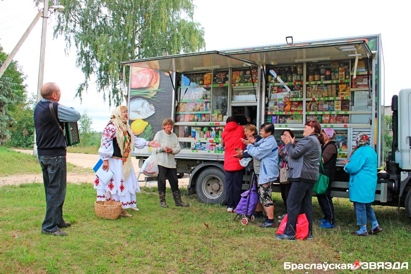 По дороге женщина пересматривает сценарий, обсуждает песенный репертуар с музыкантом. А тем временем люди собираются у торговой точки. Творческих гостей встречают радостными возгласами. Видно, что здесь их хорошо знают. Некоторые достают телефоны и начинают снимать самодеятельных артистов. Регина Брониславовна в образе веселухи Агаты начинает вести диалог о насущных делах, загадывает загадки, сыплет пословицами, угощает конфетами, поет песни. Импровизированный концерт длится минут 20-30. Когда же наступает время прощаться, звучат аплодисменты и слышны просьбы приезжать чаще.