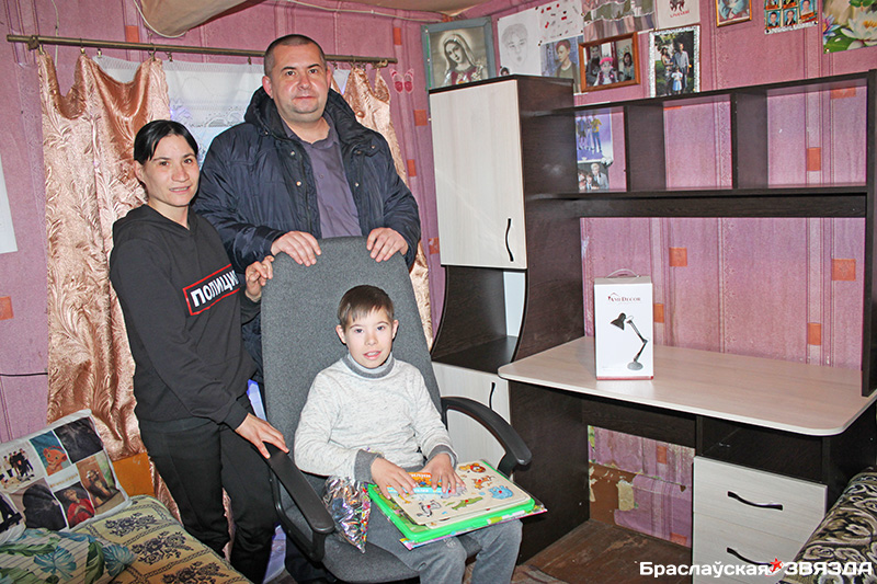 Одиннадцатилетний Денис Борковский обучается индивидуально на дому, и сотрудники СК помогли обустроить мальчику полноценное рабочее место. Теперь в его комнате разместился новый удобный стол с многочисленными полочками для принадлежностей и комфортабельное кресло. «Мы подумали, что конфеты съел – и забыл, поэтому решили, что такой подарок будет гораздо полезнее», – сказал В. Иванов, поздравляя счастливого Дениса и его родных с праздником. Но и без сладостей мальчик не остался: их вручили ему Дед Мороз и Снегурочка. ■
