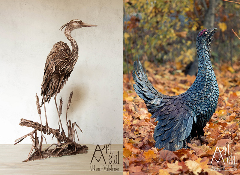 Сначала мастер создавал металлические изделия прикладного характера-эксклюзивные петли, флюгеры, подсвечники. Некоторое время были востребованы модели древнего оружия. Теперь же ремесленник отдает предпочтение скульптурным композициям. Приобретенный опыт обработки металла позволяет сегодня Александру из листового железа делать изысканные фигуры фауны. Например, на изготовление глухаря нужно было вырезать ножницами около 400 мелких металлических перьев и соединить их в единое целое. Это трудоемкий процесс, поэтому ремесленник и» пропадает » в своей мастерской, тем более что он реализует творческие замыслы всего лишь при помощи ножниц, молотка, тисков, наковальни, болгарки и электросварки. К тому же разделке нужно придать эстетичный вид: отшлифовать, покрасить, лакировать или покрыть грунтом – все в зависимости от условий, где она будет находиться.