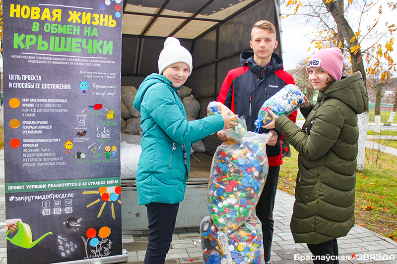 Отрадно, что браславчане тоже присоединились к благотворительному проекту. В среду спецмашину встречали возле СШ № 1 им. А. М. Жданова. Здесь готовились к ее приезду: к собранному ранее вторсырью за два осенних месяца 279 учащихся при активной помощи родителей добавили 73 984 пластиковые крышечки. Причем, по словам директора школы Людмилы Стельмаченок, 19 ребят постарались особенно: они принесли от 800 штук до нескольких тысяч, за что и были отмечены грамотами и сладкими призами. Абсолютный рекорд – 4 567 разноцветных кругляшей – у второклассницы Насти Сузько, Никита Пуйша из 9 «А» собрал 3 500, Дима Запрудник из 1 «Б» – 1 645. В результате в машину загрузили 47 мешков, наполненных крышечками.