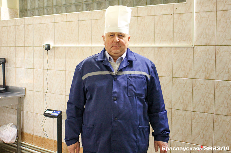 Мясные продукты колбасного цеха СПК «Маяк Браславский» заслуженно пользуются спросом у населения района. Над их приготовлением трудится весь коллектив небольшого производства, в том числе Фёдор Папков, санитарный эксперт.