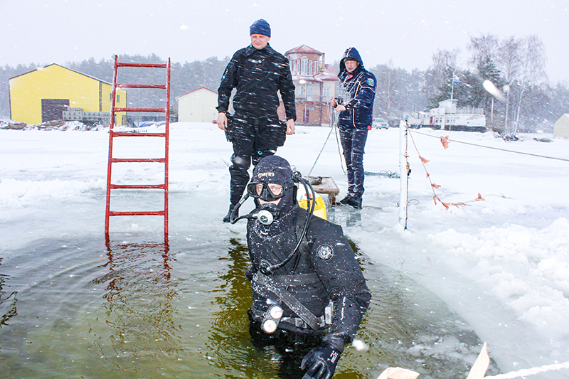 Спасатели всегда должны быть в хорошей физической и морально-психологической форме, поэтому практически ежедневно, в любое время года и при любой погоде, они проводят тренировочные спуски. Водолаз Игорь Боровик имеет свыше десяти лет стажа на спасательной станции и передает свой богатый опыт молодому поколению. Например, в понедельник он до мелочей отрабатывал навыки спуска под лед с Дмитрием Ядяло и Павлом Драбовичем. ■
