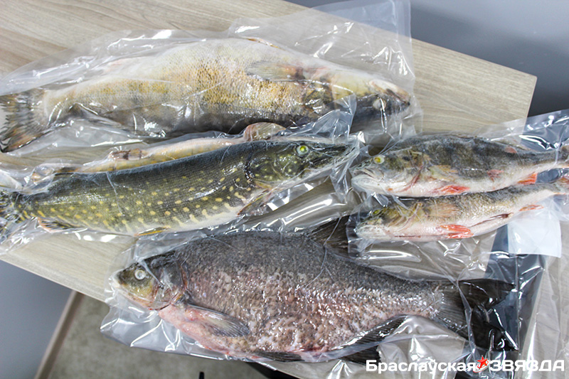 Выловленную в водоемах нацпарка рыбу, которая поступает в цех практически весь год (щука, судак, линь, лещ, окунь, карась, угорь, сазан, белый амур, жерех), здесь также чистят, моют, расфасовывают в вакуумные пакеты как потрошенную в целом виде, так и филе, стейки и подвергают шоковой заморозке. При температуре минус 18ºС она сохранит свою калорийность 6 месяцев.