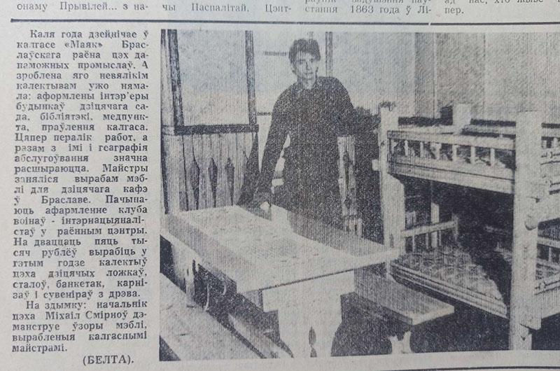 …Каля года дзейнічае ў калгасе «Маяк» Браслаўскага раёна цэх дапаможных промыслаў. А зроблена яго невялікім калектывам ужо нямала: аформлены інтэр’еры будынкаў дзіцячага сада, бібліятэкі, медпункта, праўлення калгаса. Цяпер пералік работ, а разам з ім – і геаграфія абслугоўвання, значна расшыраюцца. Майстры заняліся вырабам мэблі для дзіцячага кафэ ў Браславе. Пачынаюць афармленне клуба воінаў-інтэрнацыяналістаў у райцэнтры. На дваццаць пяць тысяч рублёў вырабіць у гэтым годзе калектыў цэха дзіцячых ложкаў, сталоў, банкетак, карнізаў і сувеніраў з дрэва...