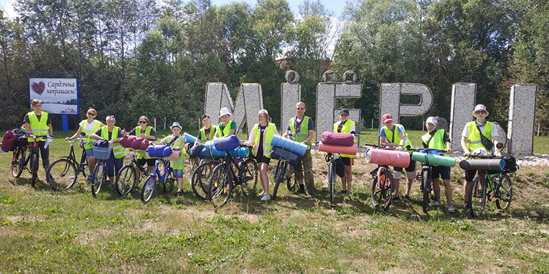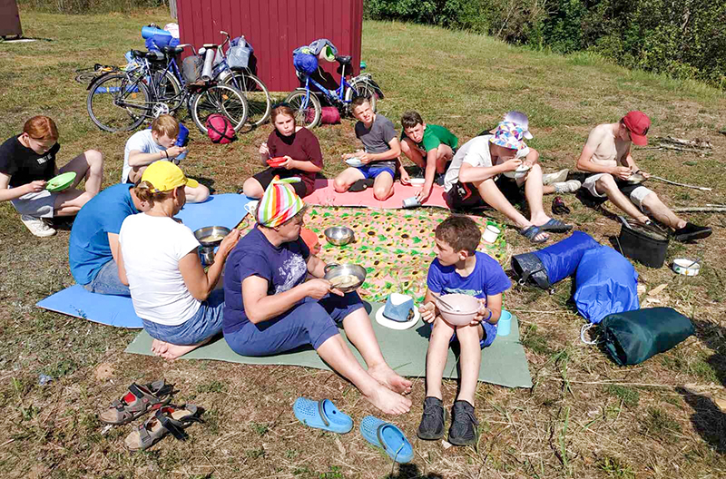 Наш маршрут пролегал по четырем районам: Браславскому, Миорскому, Шарковщинскому и Глубокскому. Протяженность велосипедной части – 302 километра, пешей – около 15. Каждый день преодолевали от 28 до 45 км. На ночлег останавливались на оборудованных стоянках либо на территории школ по предварительной договоренности. Еду готовили на костре – всё как у настоящих туристов. Наша команда состояла из десяти учеников и четырех взрослых и называлась «13+». По возрасту это дети с 6-го по 11 класс. Большинство уже ходили в такие походы. Но были и новички, которым непросто всё давалось в первые дни, однако с помощью опытных товарищей трудности преодолевались.