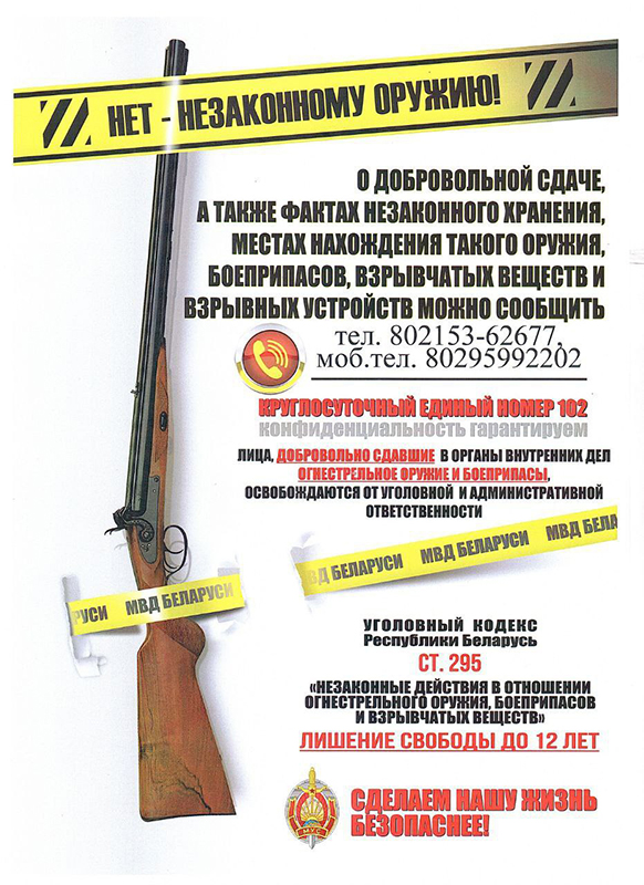 Лица, желающие добровольно сдать оружие и боеприпасы, либо предоставить информацию о гражданах незаконно владеющих оружием могут обратиться в ОВД Браславского райисполкома по тел. 62677, 35155, моб. тел. 5992202 либо 102.