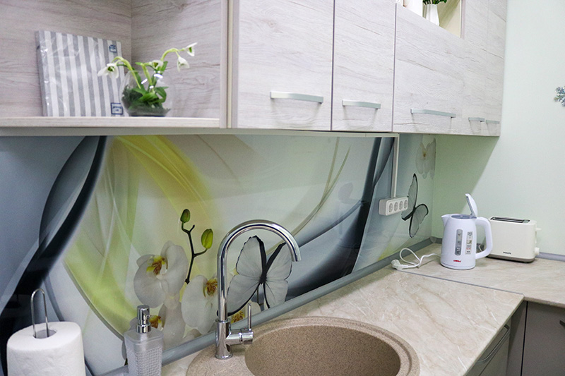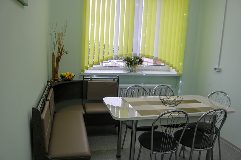 Кстати, к обустройству комнат наши медики подошли, как всегда, рационально и со вкусом. В помещениях для персонала появилось всё необходимое для технического перерыва. Это своеобразные кухни-столовые. Здесь есть вода, что было главным пожеланием, бытовая техника (чайник, микроволновая печь, холодильник), удобные столовые группы, места для хранения. Дизайном занимались сами медработники, подбирая подходящие цвета и фактуры. Одну из комнат они, например, назвали «лавандовой»: лиловые мотивы на скиналях кухни, самодельный постер и цвет жалюзи дали о себе знать.