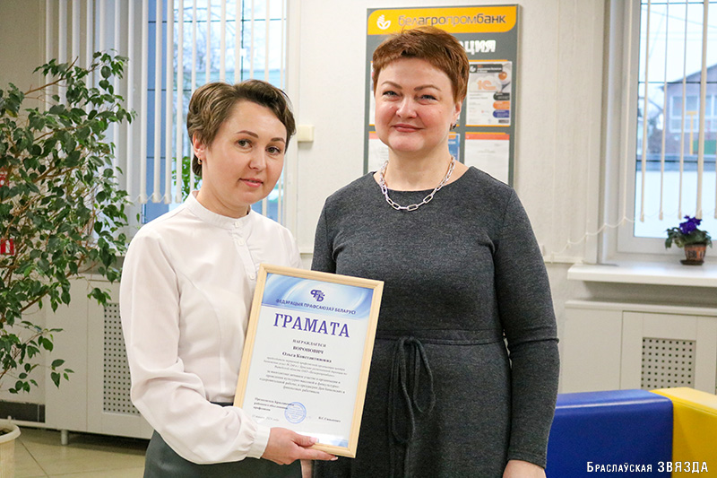 На днях председатель районного объединения профсоюзов Вероника Синькевич побывала в гостях в ЦБУ, поздравила сотрудников с их профессиональным праздником, который отмечался в этом месяце, и вручила грамоты объединения за активную жизненную позицию лидеру первички Ольге Воронович и ее помощникам по профсоюзной деятельности. ■