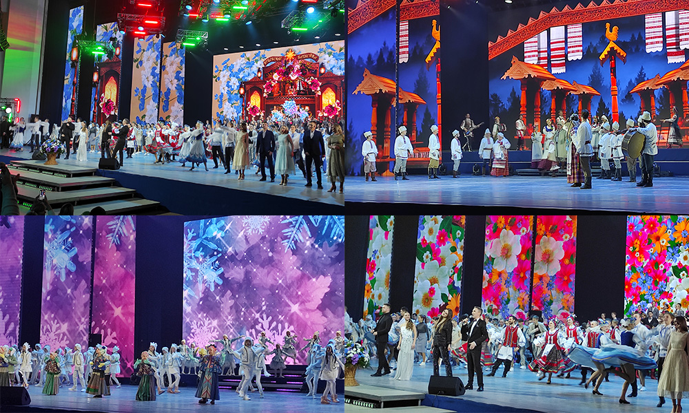 Во время же концертной программы зрителей провели сквозь историю культуры Витебщины. Творческие коллективы северного региона продемонстрировали артистизм и слаженность на сцене: каждый номер они превратили в настоящее шоу, в некоторых из них одновременно участвовали около 15 – 20 коллективов области. Красной нитью прослеживались главные идеи гала-концерта – 80-летие со дня освобождения от немецко-фашистских захватчиков, 85-летие Витебской области и объявленный в этом году Год качества.