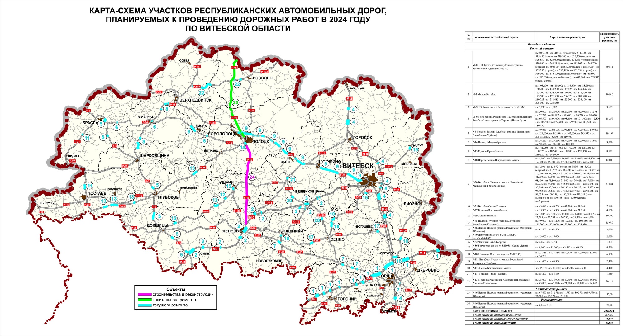 Минтранс Беларуси опубликовал карты-схемы участков дорог, на которых в 2024 году запланированы дорожные работы. Речь идет о республиканских и местных дорогах по всей Беларуси.