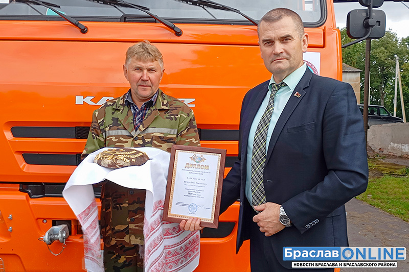 Кстати, в этом году Олег работает на новеньком «КамАЗе«, который хозяйство приобрело только весной. «Удобно, комфортно, надежно», – кратко и емко характеризует свою машину водитель. Р. Шукель добавляет: «Такие не любому доверяем — только в надежные руки!» А это действительно так. О. Петкун работает в «Маяке» с 1991 года, в том числе свыше 30 лет – на отвозке зерна. В пул победителей трудового соревнования также уже попадал: был «тысячником» в 2017-м.