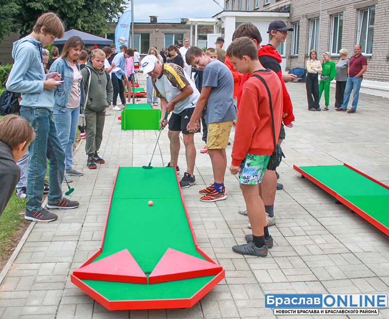 В турнире по мини-гольфу дети и педагоги соревновались на дорожках разной сложности.