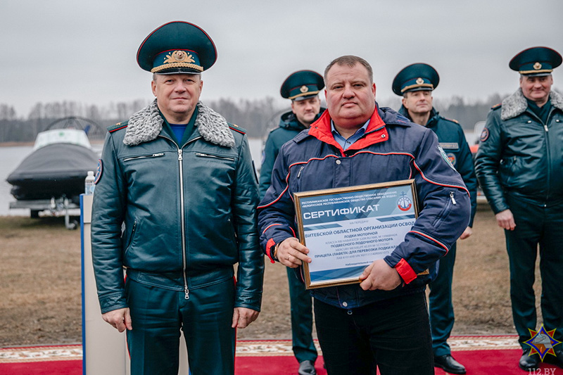 Новую специализированную лодку с лафетом получила Браславская спасательная станция. Соответствующий сертификат ее начальнику Андрею Ахрамовичу вручил в Минске министр по чрезвычайным ситуациям Республики Беларусь Вадим Синявский.