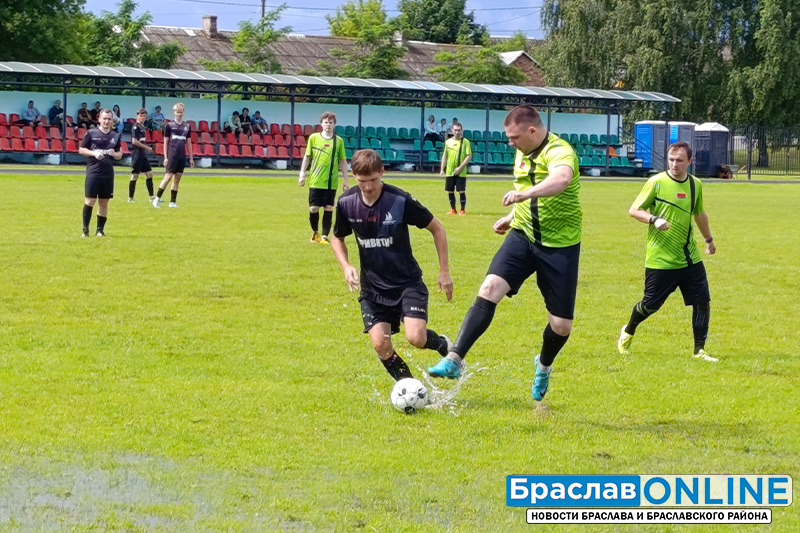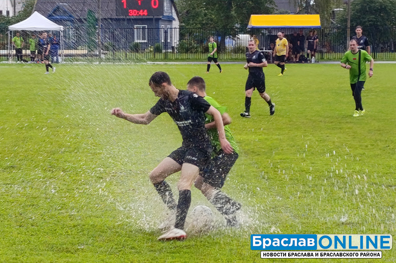…Возвращение игроков на поле наглядно показало масштаб беды: стадион оказался полностью залитым водой. Тем не менее было принято решение продолжать, что явно пришлось по душе болельщикам. С неба продолжало лить, и весь первый тайм футболисты отыграли, не только бегая по лужам, но и прикрывая глаза от хлещущих по ним капель. Не прошло и получаса, как браславчане открыли счет, который гости из Шумилино сравняли уже на 45-й минуте. На перерыв команды ушли с ничьей 1:1.