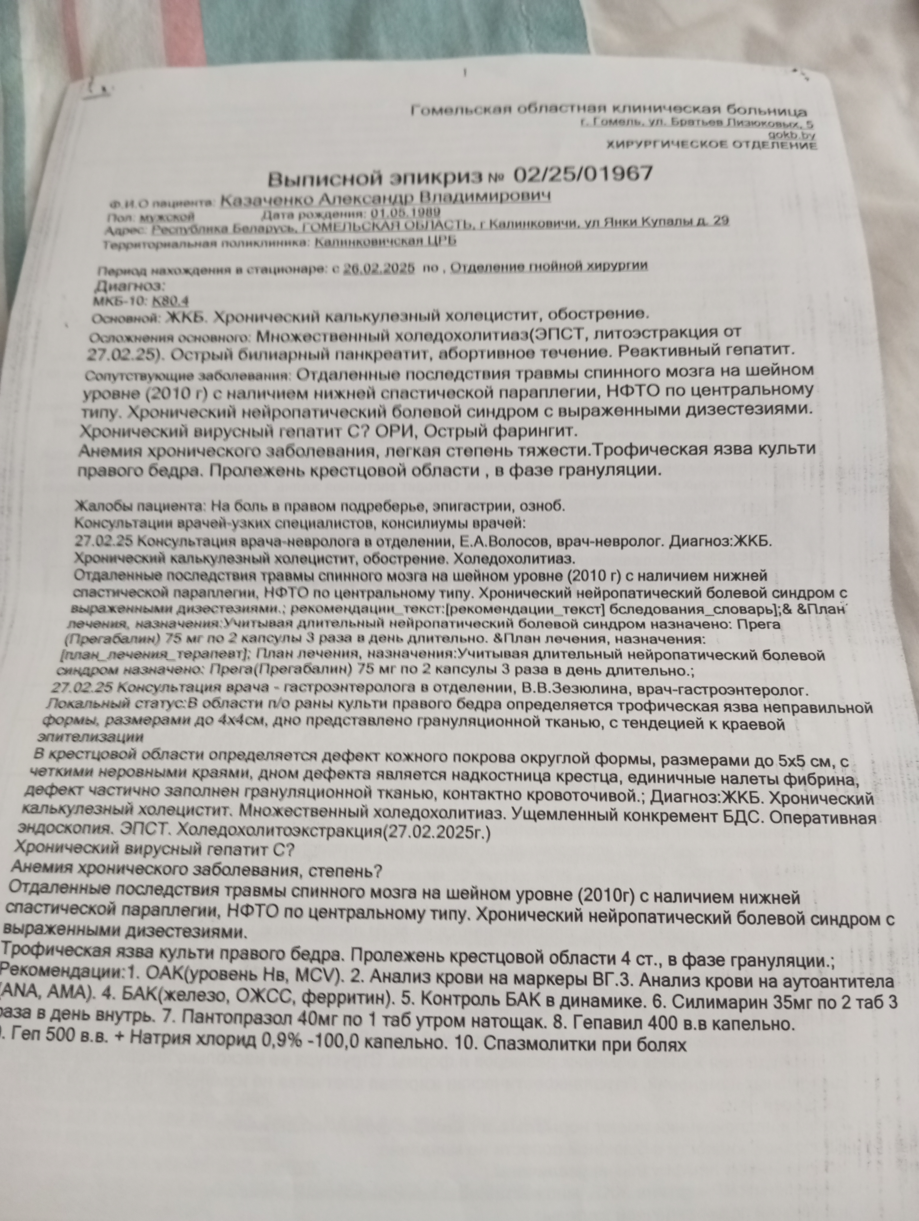 Перелом шейных позвонков спровоцировал нарушение обмена веществ, в результате чего началось усиленное выделение белка и выброс его в коленные суставы. Процесс привел к разрушению правого коленного сустава: состояние ноги ухудшалось, началось нагноение. Несмотря на неоднократные операции и попытки спасти правую ногу, в 2015 году ее ампутировали. Но беда не заставила себя долго ждать: врачи едва спасли, проведя летом 2018 года третью операцию, — из-за разрыва прямой кишки случился перитонит». Месяц назад мне сделали операцию по удалению желчного пузыря, операцию проводили не лапароскопическую, а через полостной надрез, так как операция на животе уже была.