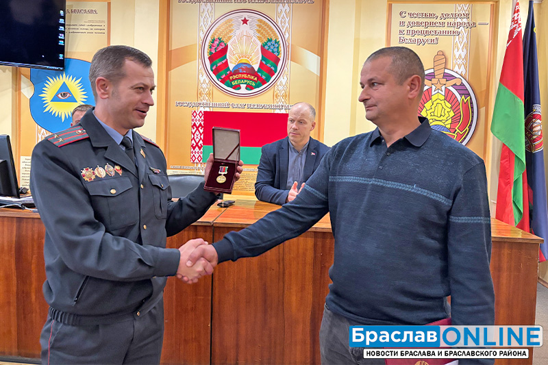В день увольнения из органов за добросовестное исполнение служебных обязанностей, безупречную службу в течение многих лет и в соответствии с приказом министра внутренних дел Республики Беларусь прапорщик милиции Иван Голубев награжден нагрудным знаком »За отличие». Высокую награду вручил ему начальник Браславского РОВД Александр Мяделко. (НА ГЛАВНОМ ФОТО)