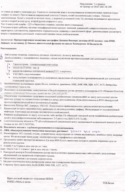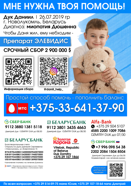 Это генетическое заболевание, характеризующееся прогрессирующей мышечной атрофией. С каждым днем мышцы Даниила слабеют, он испытывает трудности при ходьбе, подъеме по лестнице,наблюдается искривление позвоночника(лордоз). Сейчас наш сын нуждается в дорогостоящем препарате Элевидис – единственный препарат в мире, который способен остановить течение недуга. Стоимость препарата непомерно высока – 2 900 000 долларов США и, к сожалению, превышает наши финансовые возможности.