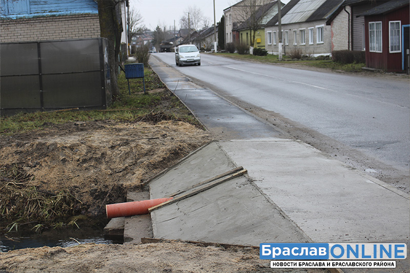 Улица Ленинская в Браславе – одна из самых старинных, поэтому откровенно узкая и неудобная для движения современных транспортных средств да и пешеходов тоже. А движение по улице достаточно интенсивное. Здесь ведь автостанция, подразделение банка, центральная аптека, храмы, Замковая гора, диагностическая станция, отели, просто выезд из города в направлении Друи. Чтобы оградить идущих от проезжей части, а значит, создать более безопасные условия для перемещения самых незащищенных участников дорожного движения, по мере имеющихся в распоряжении материальных и финансовых ресурсов несколько лет кряду ведется в стесненных условиях пространства прокладка тротуара хотя бы по одной стороне обочины. В текущем году построен очередной участок, соединивший два отеля, без пешеходного возвышения с бордюром осталось уже несколько сотен метров. Аналогичную задачу по обеспечению безопасности и комфортности для людей на участке с интенсивным движением призван выполнять и пешеходный путь по ул. Дзержинского от пересечения ее с ул. Юбилейной (здесь установлен и автопавильон для посадки-высадки пассажиров) в сторону промышленной зоны.